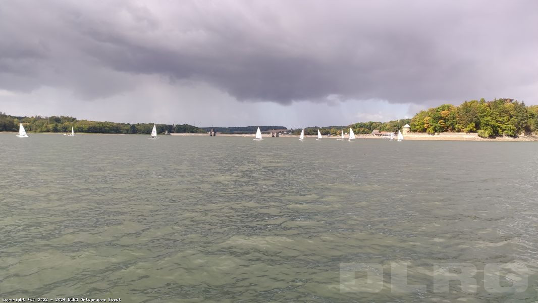 Bei drei bis sechs Windstärken machten die etwas über vier Meter langen Einhandjollen mit dem markaten Laserstrahl im Segel ordentlich Fahrt.Aufgrund des böigen Windes kam es vielfach zu Kenterungen, aktiv tätig werden mussten die Kräfte der DLRG Soest jedoch nur in einem Falle, nachdem nach dem Kentern die Kraft zum Aufrichten fehlte.Trotz des optimierbaren Wetters mit viel Regen und Wind hatten die Kräfte viel Spaß und freuen sich auf das nächste Jahr Segelkameradschaft Möhnesee Delecke!