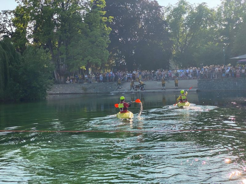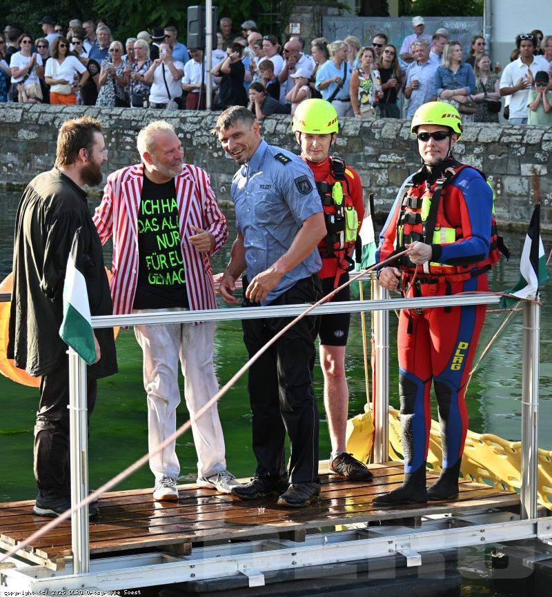 Traditionell wurden wieder drei Malefikanten in die Entenkacke des großen Teichs gewippt. Die DLRG Soest unterstützte den Bürger-Schützen-Verein zu Soest bei der wasserseitigen Absicherung mit zwei Kajaks und half den drei Malefikanten wieder aus dem Wasser. Die sanitätsdienstliche Versorgung wurde von dem DRK Ortsverband Soest übernommen.