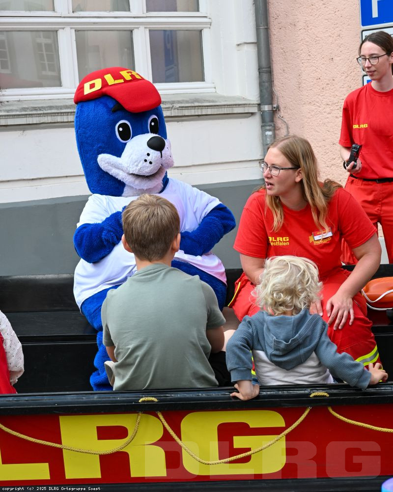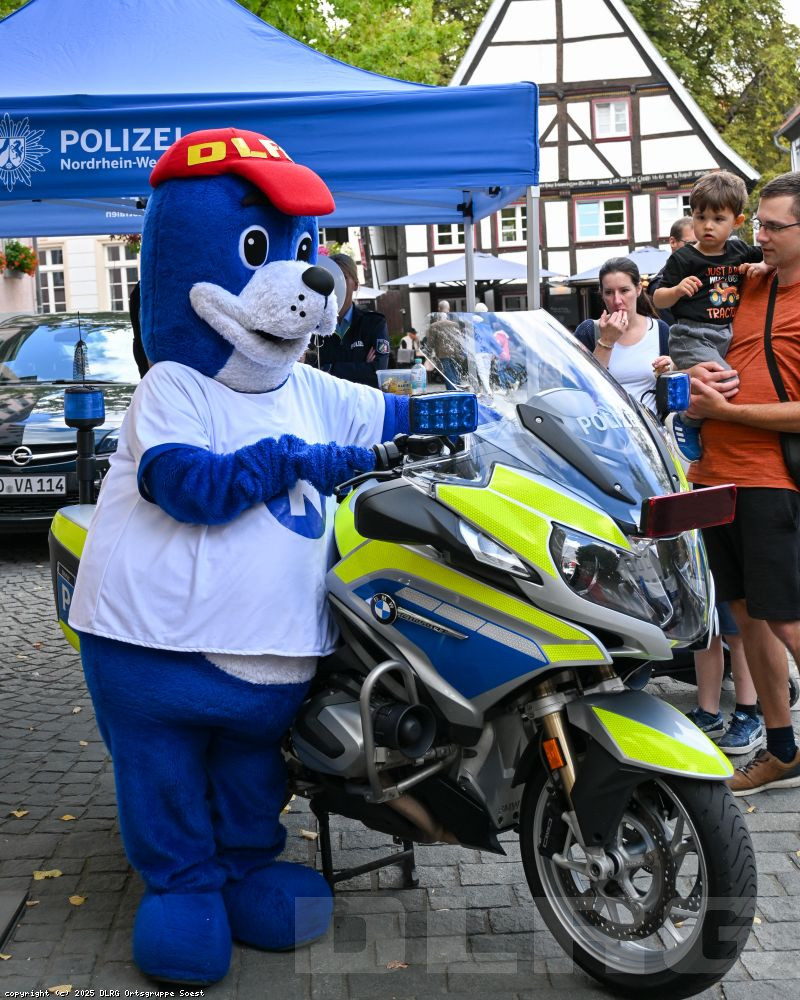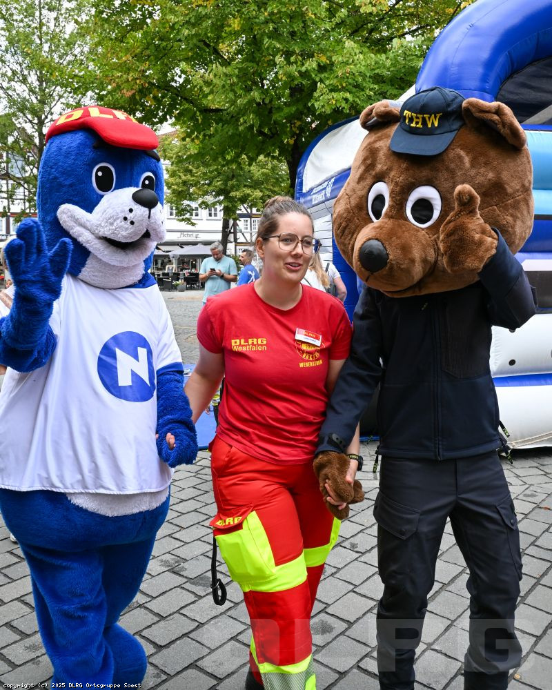 Nachdem der erste Blaulichttag im letzten Jahr ein voller Erfolg war, war den Soester Blaulichtorganisationen klar: Diese Aktion wollen wir im nächsten Jahr wiederholen! Deshalb fand am Samstag, dem 3. September, der zweite Blaulichttag in Soest statt. Die DLRG Ortsgruppe Soest e. V. stellte sich gemeinsam mit dem THW Ortsverband Soest, der Feuerwehr, dem DRK Ortsverein Soest, der Polizei Soest und dem Rettungsdienst des Kreises Soest vor. In der siebenstündigen Ausstellung hatten die Besucher die Möglichkeit, sich das Material anzuschauen und Fragen zu stellen. Bei der DLRG Soest drehten sich viele Fragen um die Sicherheit im und am Wasser oder auch um das Hochwasserboot „Schwarzer Adler“. Besonders gut kamen die Schaufensterfigur mit der Strömungsrettermontur und das Maskottchen Nobby an.