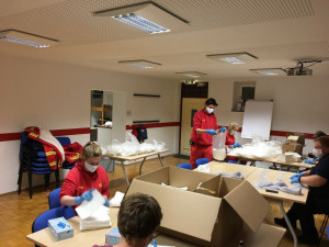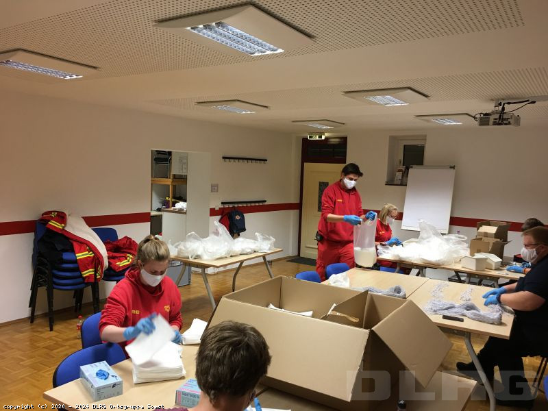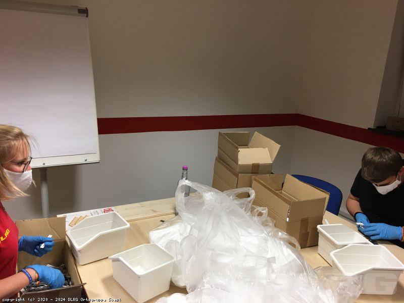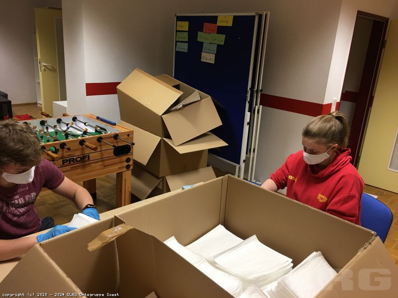 Vor zwei Wochen haben die Einsatzkräfte der DLRG Soest bereits 2.000 Masken fertig gestellt und an den Kreis Soest zurückgeliefert, für die kommenden zwei Wochen wurden heute weitere 4.000 Masken in 50er Packungen kommissioniert (die Soester Kräfte erhalten die Masken in 1.000er Kartons). Diese werden anschließend wieder zur Montage an unsere Kräfte weiter verteilt.