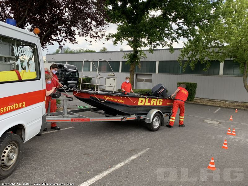 Zudem wurden das Trailern des Hochwasserboots standardisiert und Aufgabenschritte an die jeweiligen Kräfte formuliert. Fazit: Nach mehrmaligem Durchproben schaffen es unsere Kräfte nun, innerhalb von 3:40 Minuten das Boot in eine Sliprampe zu manövieren, abzuspannen und einsatzklar zu slippen. Eine perfekte Zeit und krönender Abschluss für den anspruchsvollen Tag!