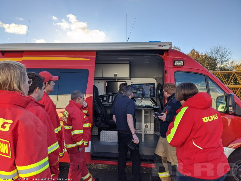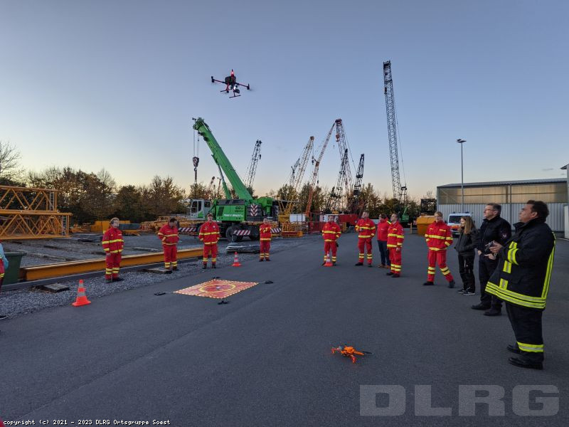 Im Rahmen einer Übung mit der DLRG Ortsgruppe Erwitte e.V., DLRG Ortsgruppe Warstein e.V. und der DLRG Ortsgruppe Lippstadt e.V. konnten einige Kräfte der DLRG Ortsgruppe Soest e.V. die Arbeit der Drohnengruppe der Feuerwehr Kreis Soest kennenlernen. Auf dem Gelände der Firma Franz Bracht Kran-Vermietung mussten drei vermisste und verletzte Personen gefunden werden. Dies gelang auch Dank dem Einsatz einer Drohne. Anschließend wurden die Verletzten durch die Sanitätsgruppe 8 der DLRG Ortsgruppe Erwitte e.V. versorgt.